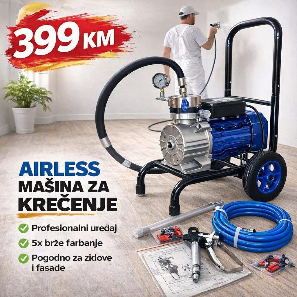 Profesionalna airless mašina za farbanje i krečenje koja omogućava brzo, ravnomjerno i kvalitetno nanošenje boje bez potrebe za kompresorom. Idealna je za krečenje stanova, kuća, hala, fasada i drugih većih površina.